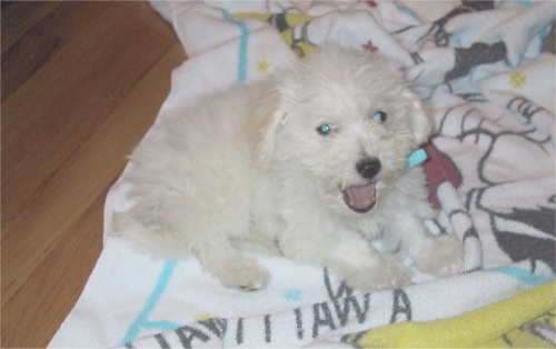 | Stanley Pup is a bichon-maltese-chihuahua mix, but as you can see he is mostly bichon. Stanley joined our family on June 18, 2001, a little over a week after the Avalanche won the Stanley Cup - hence the name. It seems to suit him. |